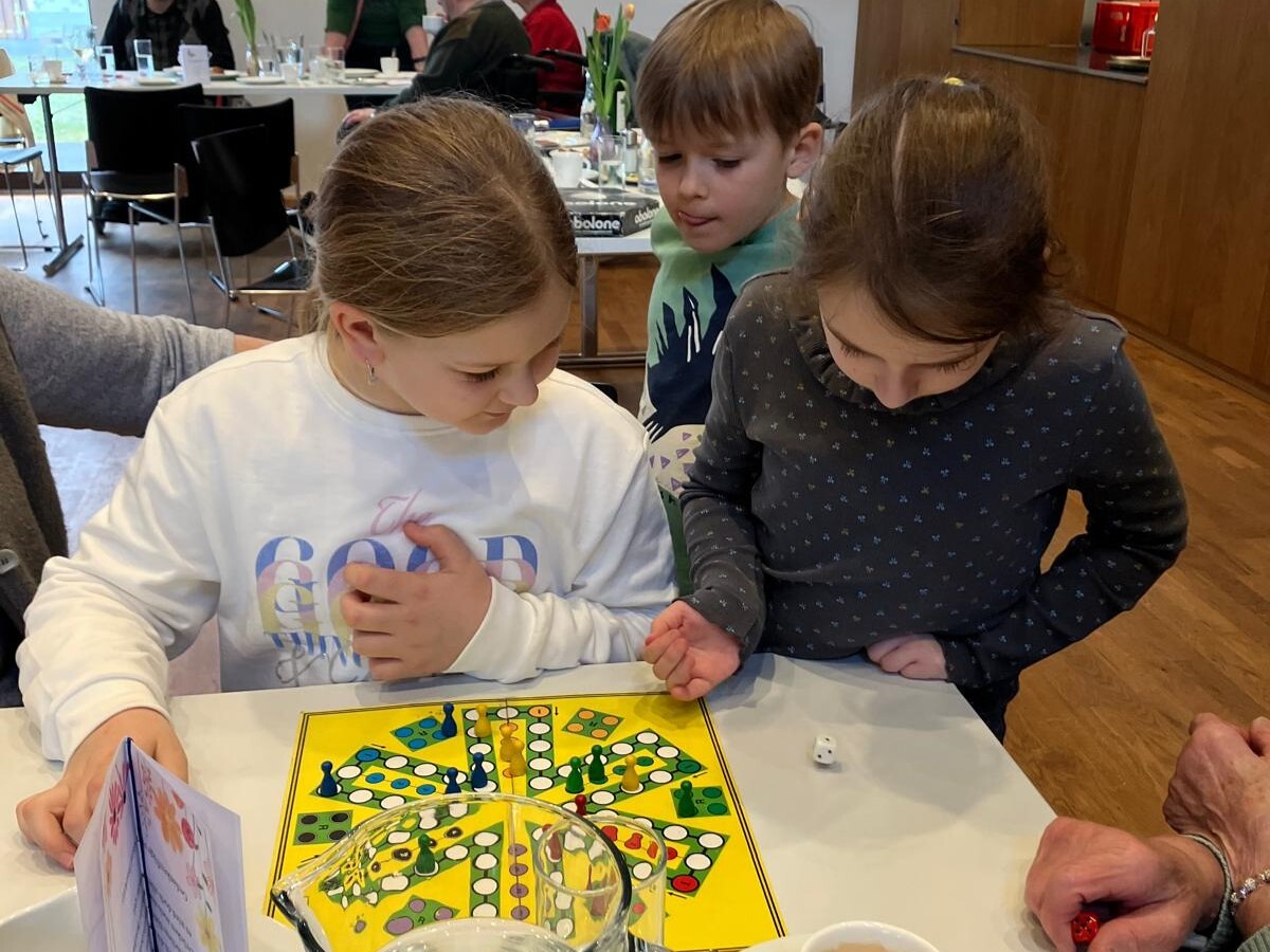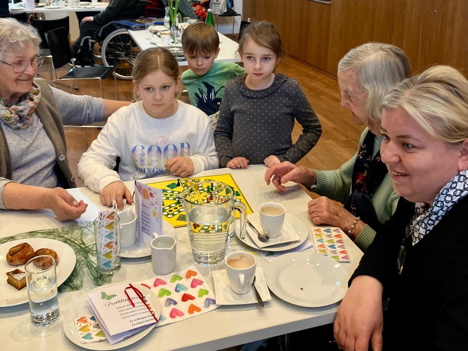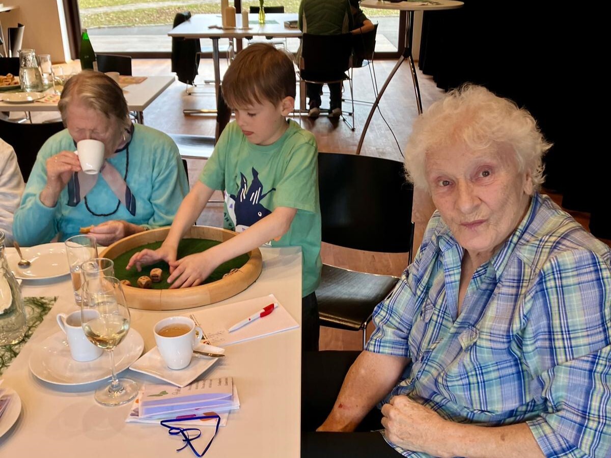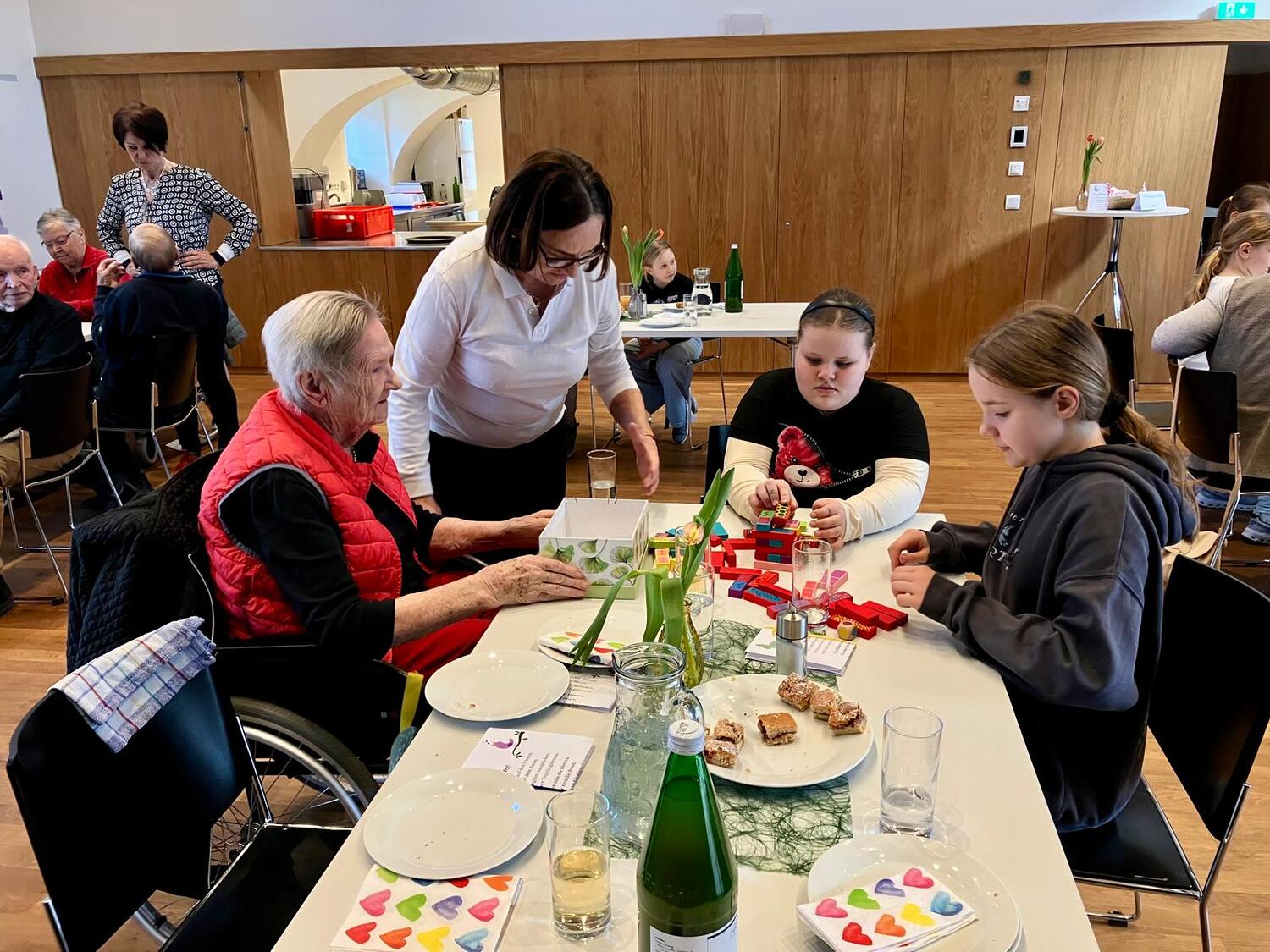 Frau Michaela Moser und Frau Susanne Schreiner überraschten die anwesenden Senioren heute mit dem Besuch einiger Kinder aus der Nachmittagsbetreuung. Der Raum war gefüllt mit lebendiger und fröhlicher Stimmung. Beim gemeinsamen Spielen mit Jung und Alt wurde viel geplaudert und gelacht. Die Kuchenteller leerten sich rasch und bei Kaffee, Wein und gesponserten Säften, waren alle Gäste bestens versorgt.