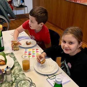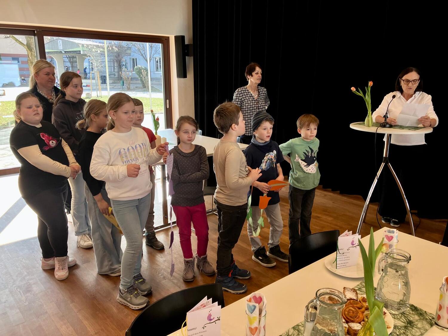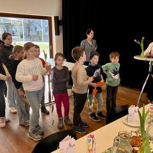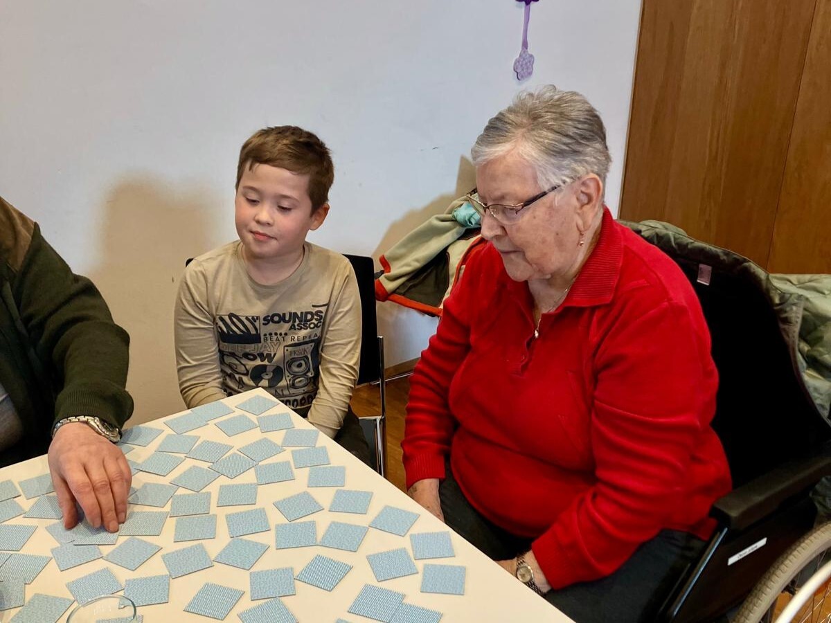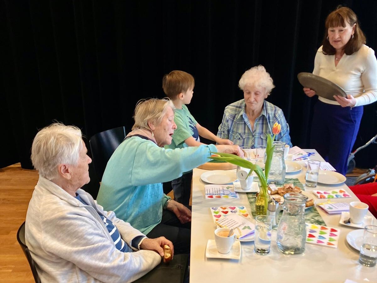 Frau Michaela Moser und Frau Susanne Schreiner überraschten die anwesenden Senioren heute mit dem Besuch einiger Kinder aus der Nachmittagsbetreuung. Der Raum war gefüllt mit lebendiger und fröhlicher Stimmung. Beim gemeinsamen Spielen mit Jung und Alt wurde viel geplaudert und gelacht. Die Kuchenteller leerten sich rasch und bei Kaffee, Wein und gesponserten Säften, waren alle Gäste bestens versorgt.