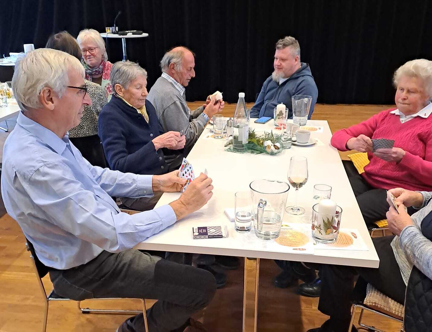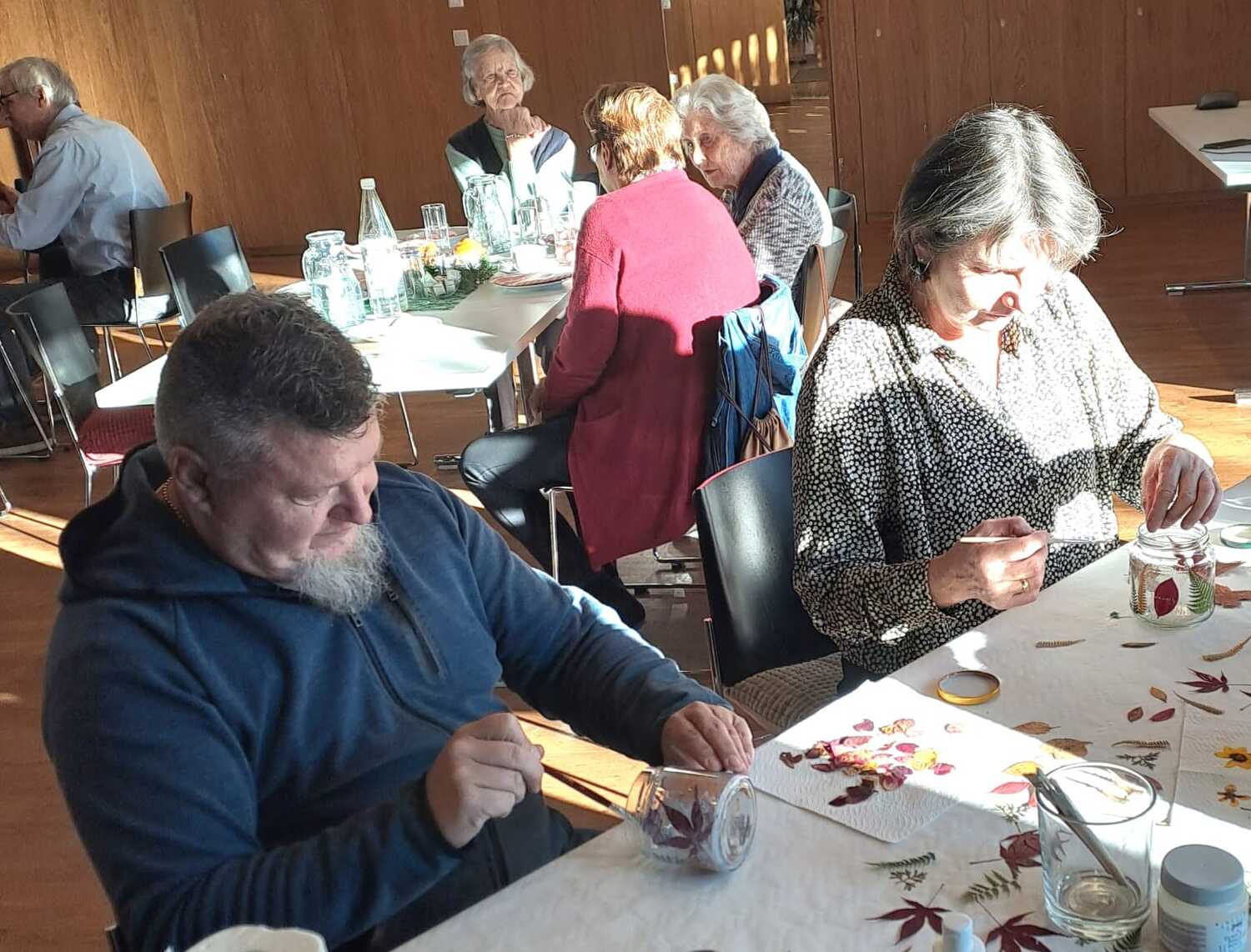 Am Fest­tag des Hei­ligen Martin tra­fen sich die Gäs­te des Se­ni­oren­nach­mit­tags wie­der in ge­müt­lich­er Runde zum an­ge­reg­ten Aus­tausch, zum Kar­ten spie­len und  be­geis­ter­te Bastler:­innen waren ein­ge­la­den, selbst Licht­gläser und Ker­zen mit bun­ten Herbst­blät­tern zu ver­zier­en.