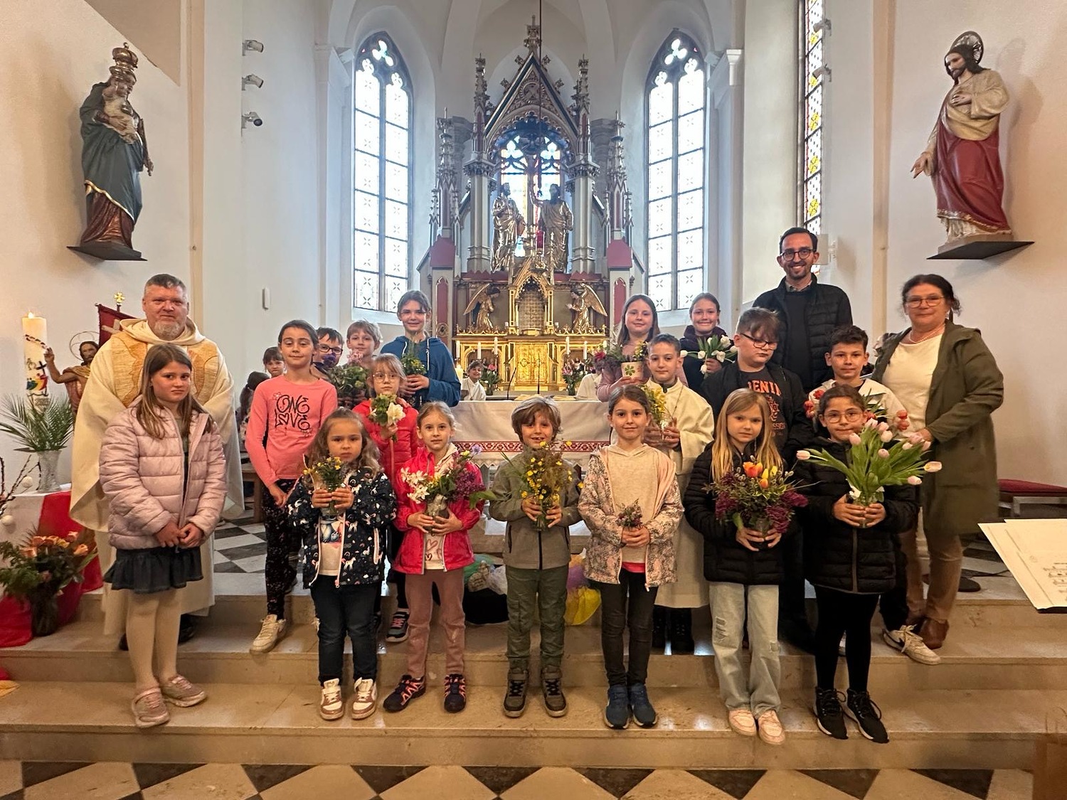 Die Emmauswanderung fiel zwar ins Wasser, aber das tat der Stimmung beim Ostergottesdienst der VS-Gamlitz keinen Abbruch. Stellvertretend für die Klassen brachten einige Kinder bunte Blumen zum Altar. So wie im Frühling das neue Leben in der Natur erwacht, so dürfen wir das neue Leben unseres Herrn Jesus feiern.