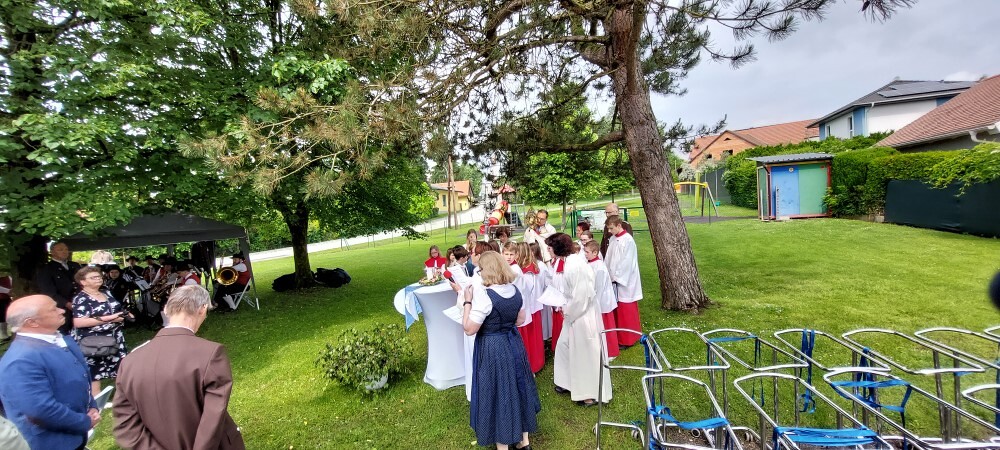 Gemeinsam mit der Pfarre Tobelbad feierten wir das Fronleichnamsfest beim Dorfkreuz in Lieboch. Der auferstandene Herr Jesus, der in der Gestalt des Brotes gegenwärtig ist, steht im Mittelpunkt.