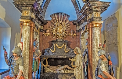 Kostbarkeit Heiliges Grab Nachbildungen des Heiligen Grabes von Jerusalem - mit lebensgroßen Figuren - wurden ab dem Hochmittelalter als Hintergrund für Osterspiele verwendet. mehr: Heiliges Grab