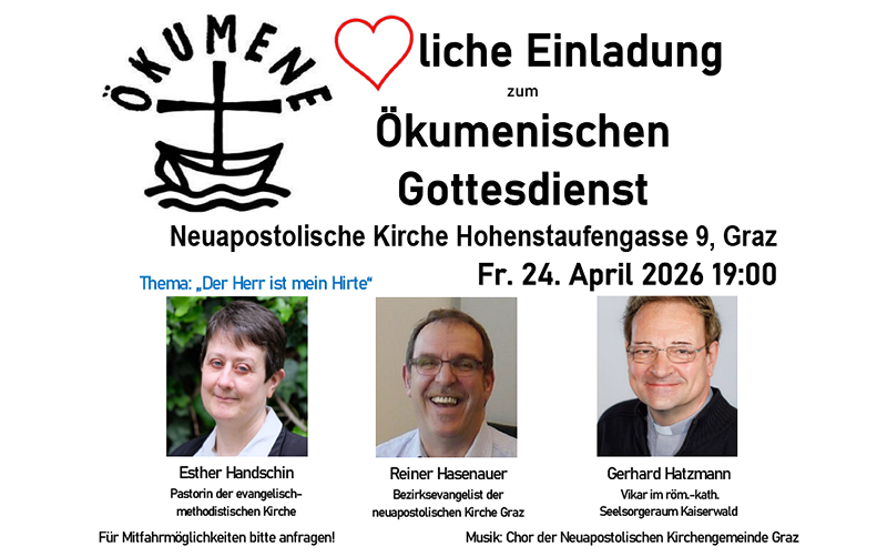 Herzliche Einladung zum Ökumenischen Gottesdienst in der Neuapostolischen Kirche in Graz am Freitag, 24. April 2026 um 19:00 Uhr!